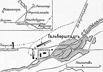Чернышев «из перехваченного донесения» узнал о приближении к Гальберштадту из Гессена по брауншвейгской дороге второй части обоза (16 пушек) с отрядом охраны 4500 человек. Выбора не было. Пришлось сходу, несмотря на усталость, атаковать неприятеля. Фактор неожиданности не сработал: дивизионный генерал Охс успел узнать о приближении отряда Чернышева и принял меры для обороны. Он расположил артиллерию в виде четырёхугольника на расстоянии 1 версты от города. Пехота вестфальцев была расположена внутри четырёхугольника, а кавалерия по сторонам. Часть орудий были направлены на дорогу, другая — на поле. Позиция неприятеля «усиливалась» естественными препятствиями: рекой Гольцема и рвами перед брауншвейгской дорогой . «Казачий полк Сысоева был выслан на брауншвейгскую дорогу»[6], для заслона охранному отряду второй части обоза. Полковник Власов должен был атаковать силы Охса на фронте «на пространстве между речкой и дорогой»[6]. Чернышев с оставшейся частью отряда «расположился фронтом к дороге».
