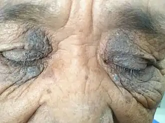 Болезнь проявляется появлением папул и бляшек жёлтого цвета. Возникают открытые комедоны чёрного цвета, которые не воспаляются. Локализация преимущественно в областях открытых солнечному свету: височная область, щеки, лоб, периорбитальная область, тыл кистей и предплечья. Со временем развития заболевания, кожа на пораженных участках утолщается с образованием множественных маленьких, часто сливающихся друг с другом, узелков. Узлы наполнены кератином[1].