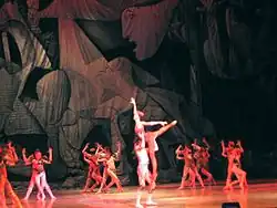 Однако, лишив их каких-либо отличительных черт, кроме красного цвета поверхности стола и чёрного — одежды танцовщиков[* 2], балетмейстер придал своему произведению отвлечённый, вневременной и вненациональный характер. Он добился «слияния двух идей: музыкальной — оркестровое crescendo и хореографической — параллельное нарастание движения, жеста, страсти», что породило «магию некоего мистического ритуала, куда вовлекаешься без остатка»[11]. В постановке были заняты только мужчины — 20 артистов кордебалета и 18 (либо 22) фигурантов.