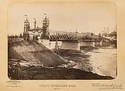 Мост, проект которого утвердил лично император Александр II, был назван Бородинским. Работы начались в июле 1867 года. Металлоконструкции пролётного строения были изготовлены на Коломенском заводе. Открытие моста состоялось 17 марта 1868 года, отделочные работы были окончены через 8 месяцев[5].