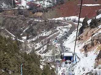 С левой стороны — автотрасса Чарвак — Ташкент, справа — железнодорожная ветка Ходжикент — Ташкент.