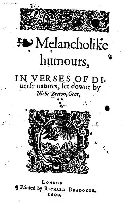 В 1600 году были опубликованы «Меланхолические гуморы» (Melancholike Humours in Verses of Diverse Nature) — одно из немногих изданий, где имя Н. Бретона на титуле указано полностью.