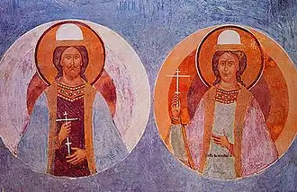 В ЛЕТО 7010 МЕСЯЦА АВГУСТА ВЪ 6 НА ПРЕОБРАЖЕНИЕ ГОСПОДА НАШЕГО ИИСУСА ХРИСТА НАЧАТА БЫСТЬ ПОТ… А ЦЕРКОВЬ + А КОНЧАНА НА 2 ЛЕТО МЕСЯЦА СЕНТЯВРЕА ВЪ 8 НА РОЖДЕСТВО ПРЕ-СВЯТЫА ВЛАДЫЧИЦА НАШЫА БОГОРОДИЦА МАРИА. ПРИ БЛАГОВЕРНОМ ВЕЛИКОМ КНЯЗЕ // ИВАНЕ ВАСИЛИЕВИЧЕ ВСЕА РУСИ ПРИ ВЕЛИКОМ КНЯЗЕ ВАСИЛИЕ ИВАНОВИЧЕ ВСЕА РУСИ И ПРИ АРХ … ХОНЕ + А ПИСЦИ ДЕОНИСИЕ ИКОННИК СЪ СВОИМИ ЧАДЫ О ВЛАДЫКО ХРИСТЕ ВСЕ ЦАРЮ ИЗБАВИ И ГОСПОДИ МУК ВЕЧНЫХ.