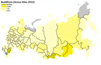 В России буддизм традиционно исповедуют буряты, калмыки, тувинцы и часть эвенков (в Бурятии)[9][7]. Основные регионы их проживания — Бурятия, Агинский Бурятский округ (Забайкальский край), Усть-Ордынский Бурятский округ (Иркутская область, здесь в меньшей степени), Калмыкия и Тува. Численность этнических буддистов данных регионов составляет около 900 тысяч человек[35]. В последние десятилетия буддийские общины, в том числе русские, возникли в Москве, Санкт-Петербурге, Самаре и некоторых других российских городах, не связанных с традиционными регионами буддизма[9][36]. Число буддистов в данных городах, согласно опросам, составляет около 1 % их жителей. Такой же процент составляет число буддистов в масштабе всей страны[37][38]. Численность российских буддистов, выполняющих практику, составляет не более 500 тысяч человек[39].