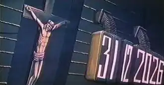 ![]() Робот, охотясь за влетевшей в дом чайкой, протыкает распятие Иисуса Христа (кадр из мультфильма) | |