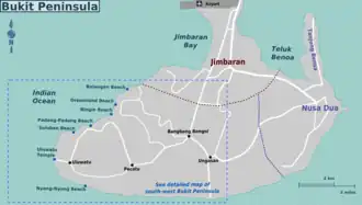 Южный и восточный берега полуострова омываются водами Индийского океана, западное побережье выходит на пролив Бали, который соединяет Индийский океан с Тихим. Берега в целом изрезаны не очень значительно, лишь в северо-восточной части имеется узкий длинный мыс Беноа, у оконечности которого находится небольшой остров Серанган, противоположный берег которого, в свою очередь, находится на расстоянии нескольких сот метров от основной территории Бали. Акватория к востоку от перешейка, в значительной степени замыкаемая мысом Бено́а и островом Серанган, известна как залив Беноа, а акватория к западу от перешейка — как Джимбаранская бухта (индон. Teluk Jimbaran)[1][2].