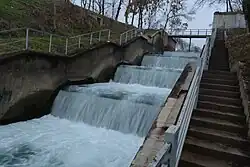 - Холостой водосброс, реализованный по принципу ступенчатого перепада;