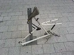 Есть замки, стационарно крепящиеся на перья и блокирующие заднее колесо. Плюс такого замка — низкий вес и удобство использования: для запирания нужно просто нажать на рычажок, а для отпирания — повернуть ключ. Минус — велосипед никак не крепится к другим предметам, единственное от чего он защищён — на нём нельзя уехать своим ходом, но его можно просто унести.