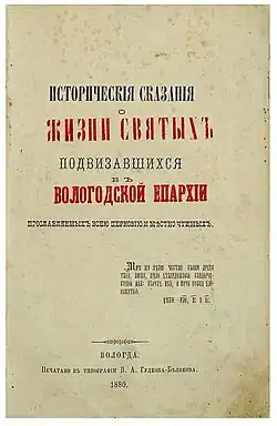 - Исторические сказания о жизни святых подвизавшихся в Вологодской епархии прославляемых всею церковью и местно чтимых / [Свящ. Иоанн Верюжский]. — Вологда : тип. В. А. Гудкова-Белякова, 1880. — (8), 692, (2), 6 с. ; 25 см