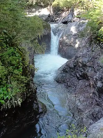 Здесь образовался водопад высотой 8 метров. Однако верхние края коридора продолжаются и далее. Из этого можно заключить, что первоначально водопад был ниже по течению, и если бы удалось определить, сколько вода стирает ложе водопада в течение года, то можно было бы сказать, когда он начал свою работу, сколько ему лет и сколько ещё осталось существовать на свете. Порода, сквозь которую вода пробила себе дорогу, — буро-красный глауконитовый песчаник с весьма плотным цементом. Цвет воды в массе изумрудный. При ярком солнечном освещении белая пена с зеленовато-синим цветом воды и с красно-бурыми скалами, по которым разрослись пёстрые лишайники и светло-зелёные мхи, создавала картину чрезвычайно эффектную. Под водопадом вода имеет вращательное движение. В течение многих лет она сточила породу по сторонам и образовала «исполиновый котёл». Я подошёл к краю обрыва, и мне показалось, что от массы падающей воды порой содрогается земля.