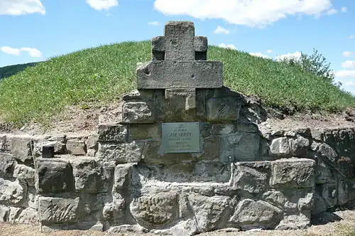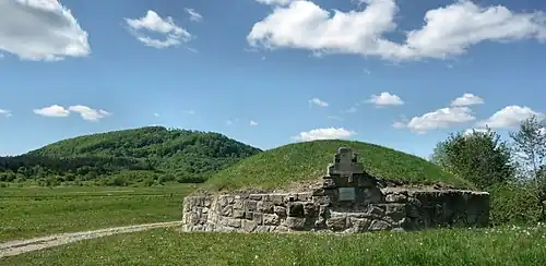 Братская могила в виде округлого кургана, обнесённого каменной кладкой, располагается в 150 метрах от асфальтированной дороги.