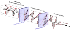 Электрическое поле параллельно оптической оси  Электрическое поле перпендикулярно оптической оси  Сумма полей Линейно поляризованный свет, попадающий на полуволновую пластинку, можно разделить на две волны, параллельные и перпендикулярные оптической оси волновой пластинки. В пластине параллельная волна распространяется немного медленнее, чем перпендикулярная. На дальней стороне пластины параллельная волна задерживается ровно на половину длины волны по сравнению с перпендикулярной волной, и результирующая комбинация является зеркальным отражением состояния входной поляризации (относительно оптической оси).