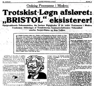 В августе 1936 года, во время Первого московского процесса, подсудимый Эдуард Гольцман заявил, что получал инструкции об «устранении» Иосифа Сталина от Льва Троцкого во время встречи с последним в Копенгагене в ноябре 1932 года — местом первоначальной встречи был «холл гостиницы „Бристоль“», расположенный вблизи копенгагенского железнодорожного вокзала, в котором Гольцмана ожидал сын и помощник Троцкого, Лев Седов.