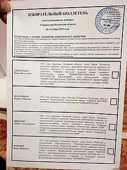 - ↑ Кандидат от "Родины" отказался от участия в выборах губернатора Псковской области. TACC. Дата обращения: 15 августа 2023. Архивировано 15 августа 2023 года.