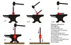 Стоит различать два смежных метода обработки металла: осадку и высадку. В первом случае имеется в виду выполнение процесса по всей длине заготовки. Во втором случае обрабатывается только часть заготовки. Конец заготовки, который необходимо «осадить» нагревается в горне или печи до температуры ковки. Длина поковки или нагретой части заготовки при высадке не должна превышать 2-2,5 диаметра заготовки, иначе она изогнется. Если нет возможности ограничить зону заготовки, то на ней зубилом делают засечки на месте высадки. Затем разогретую заготовку берут клещами и быстро охлаждают в воде концы, а часть, отмеченную засечками оставляют разогретой.[2] Мастер ставит заготовку на наковальню разогретым концом и обозначает места ударов, а также силу удара. Под воздействием кувалды нагретый металл деформируется, увеличивается его диаметр и уменьшается длина. При этом холодный участок металлического полотна не подвергается деформации и остается в первоначальной форме. Конец заготовки под ударами может принимать различную форму, в том числе форму цилиндра. При необходимости операцию повторяют несколько раз. Длинномерные заготовки со значительной массой можно высаживать без молотка, нанося удары по наковальне непосредственно самой заготовкой. Если утолщение приобрело неправильную форму или сместилось, то операцию повторяют или устраняют дефект с помощью проковки.