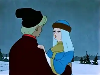 А в это время в царском дворце царь Горох сообщил своей дочери, Марье-царевне, о готовящейся свадьбе. Тогда к царю приезжал заморский принц, чтобы посвататься за его дочь. Тем временем упросила мать как раз Емелю поехать в лес за дровами, и последний согласился сделать это. Поэтому он, сказав заклинание «По щучьему велению, по моему хотению!», на санях поехал за дровами. Но, по случайности, он по дороге не только удивил и распугал прохожих, но и снёс крышу с чужой избы. Также он наехал на карету, в которой находились принц и его советник, и те даже не услышали его предупреждение «Берегись!».