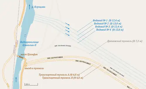 В то время как Цзиньпин-I полагается на обычную высокую плотину и большой резервуар для подачи воды, Цзиньпин-II использует гораздо меньшую плотину, расположенную в 7,5 км. км ниже Цзиньпин-1, которая отводит воду на четыре 16,6-км туннеля с оголовьями. Эти туннели соединяются с точкой вниз по течению той же реки на гораздо более низком уровне, обеспечивая 310 метров (1020 футов) напора воды [2] без затопления большой площади суши.
