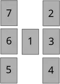 | Компас | Предназначен для гадания по вопросу «Что будет, если…» с несколькими альтернативами. | Карты выложены в форме n-лучевой звезды, где n — число рассматриваемых альтернатив. На иллюстрации показан полный вариант расклада, на 8 альтернатив. При выкладывании карт каждому лучу (четвёрка карт, от 1 до 4буква) ставится в соответствие один из предполагаемых вариантов действий. Карты выкладываются от 1, сначала все 2, по часовой стрелке, затем все 3, затем все 4. Карты на луче (1 — общее для всех начало) означают, в применении к соответствующей альтернативе: 1) Текущая ситуация. |