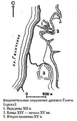 Судя по археологическим раскопкам П. А. Раппопорта, первый деревянный детинец был возведён в середине либо в конце XII века[1] на месте более древнего славянского поселения. Он находился в черте современного города на покатом юго-восточном берегу Галичского озера на холме Балчуг. Сегодня это место известно как так называемое Нижнее городище. Трапециевидная площадка (260 на 200 м) северо-западным краем примыкает к берегу озера. Внизу она горизонтальная, затем резко (под углом 25 градусов) поднимается вверх и здесь снова становится относительно плоской. Городище по периметру обнесено валами, по краям проходящими над глубокими оврагами. С напольной юго-восточной стороны вал особенно мощный и перед ним открыт глубокий ров.