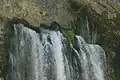 Гегский водопад. Слева виден снежник- Гегский водопад. Слева вверху вход в грот