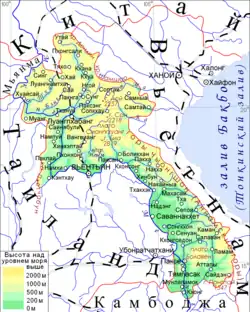 Территория Лаоса на две трети покрыта густыми лесами, ландшафт состоит из невысоких холмов и гор, самая большая вершина, Биа, имеет высоту 2820 м[1]. Река Меконг течёт по границе Лаоса с Таиландом и Мьянмой, границу с Вьетнамом разделяют горы Чыонгшон, которые простираются на половину страны. В центральной части Лаос отделяется от Таиланда горами Луангпхабанг.