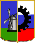 «В лазоревом поле со включенной зеленой узкой оконечностью, поверх всего - золотая мельница с четырьмя косвенно обращенными крыльями, увенчанная серебряной летящей пчелой. Щит увенчан золотой муниципальной короной установленного образца».