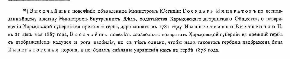 21 мая 1887 года по ходатайству Харьковского дворянского общества Александром Третьим городу и губернии[19] был возвращён «екатерининский» герб, сохранивший, однако, обрамление нового герба — императорскую (а не обычную городскую) корону и дубовые листья с Андреевской лентой.[26] Данный герб просуществовал до провозглашения Советской власти и использовался в архитектуре (в витражах, лепке, мозаике на фасадах зданий), — например, Алексеем Бекетовым.