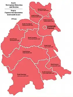 Во время Первой мировой войны Буковина стала местом военных действий между Австро-Венгрией и Российской империей. Она несколько раз была занята российскими войсками. На этих территориях с 19 августа до 7 октября 1914 и 15 ноября 1914 — 1 февраля 1915 год существовала Черновицкая губерния Галицийского генерал-губернаторства (Её главой был С. Д. Евреинов)[13]. В 1915 года после Великого отступления 1915 года Буковина вернулась под контроль Австро-Венгрии.