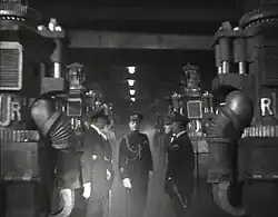 Впечатляюще сделана сцена, когда на рабочий поселок рядами движутся колонны роботов, мерно переставляя ноги. Перед ними отступает Джим Рипль, он пятится, судорожно играет на кларнете, пытаясь остановить механических чудовищ музыкальным сигналом. Тщетно. Он погибает, растоптанный роботами, — классический мотив убийства творца его творением сохранен.