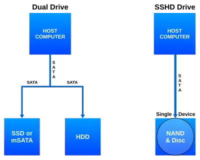 Существует две основных «гибридных» технологии хранения данных, которые сочетают в себе NAND флэш-память (SSD) с HDD технологией: Dual-привода гибридных систем и гибридных твердотельных накопителей.