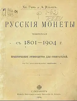 - ↑ Хр. Гиль и А.Ильин. Русcкiя монеты чеканенныя съ 1801—1904 г. / Картографическое заведение А.Ильина.- СПб.: 1904