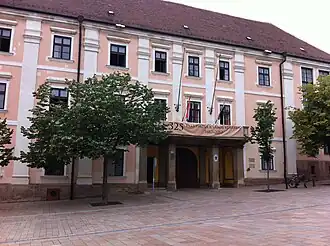 Новая школа была основана орденом цисторианцев при монастыре в 1687 году — сразу же после изгнания из города турок. Она сразу заняла участок, на котором находится её сегодняшнее здания, а также получила несколько других земельных участков в течение нескольких последующих лет. Большую помощь школе оказал архиепископ Эстергом Сечени, пожертвовавший ей 50 000 форинтов в 1694 году. Из-за ряда сложностей — включая юридические — строительство нового здания началось только в 1724 году. Количество учеников в ней выросло от изначальных шестнадцати до нескольких сотен в середине 1720-х годов.