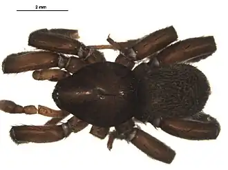 Тело овальное длиной 3-12 мм. Боковые глаза, обычно, крупнее средних. Нижняя губа длиннее своей ширины, на конце закруглена[1]. Желобок хелицер с зазубренным килем по заднему краю. На теле нет перистых волосков[3]. Низ головогруди от светло-оранжевого до светло-коричневого цвета. Ноги с многочисленными шипами и длинными щетинками. Лапки с двумя зубчатыми коготками. Брюшко темно-оранжевое до коричневого цвета. У самцов спереди на брюшке имеется передний темный блестящий щиток[1].
