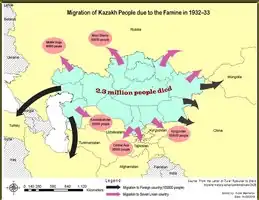 В результате, в течение 1931—1933 годах умерло от 2,3 млн чел. (оценка Роберта Конквеста)[9] до 3,25 млн чел. (оценка Абылхожина, Козыбаева и Татимова, 1989). Около 1 миллиона казахов вынуждены были откочевать в сопредельные Казакской АССР регионы Российской Федерации, в том числе Киргизскую АССР, Каракалпакскую АССР, Саратовский, Сталинградский и Средневолжский края, Оренбургскую, Челябинскую, Омскую области, а также Западно-Сибирский край. Имели место откочёвки и в сопредельные союзные республики: Туркменскую ССР и Узбекскую ССР. За пределы СССР значительное число казахов откочевало в Китай, Монголию, Иран и Афганистан. Впоследствии 0,4 млн казахов совершили обратную откочёвку в Казахстан. Насильственные меры по переводу кочевников на оседлый образ жизни привели к огромным жертвам, в основном среди казахского населения[10].