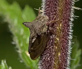 Нимфы в период роста обычно не покидают кормовых растений, к которым относятся ластовень, бодяк, чертополох и крапива[1]. Имаго проводят время на вершине травянистых растений и на кустарниках[6], но чаще встречаются на молодых деревьях[7], таких как тополь, дуб, рубус, слива и других[1].