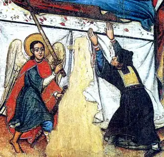 Фрагмент иконы Успение, последняя четверть XVII века, Никольская церковь в Кричаве. Еврей, посягающий на покров Богородицы, и ангел, отсекающий ему кисти рук. «Этнографические» детали костюма еврея: нагрудник со свисающими нитями, белые чулки, халат[29]