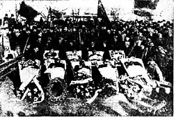 ![]() Делегаты первой конференции Советов рабочих и крестьянских депутатов Донбасса. Бахмут, март 1917. | ||||