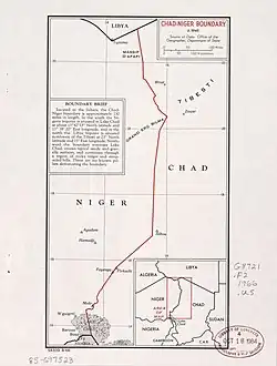- 1 2 3 4 5 6 International Boundary Study No. 73 – Chad-Niger Boundary (PDF), 1 августа 1966, Архивировано (PDF) 1 октября 2019, Дата обращения: 5 октября 2019 Источник. Дата обращения: 27 декабря 2021. Архивировано 4 августа 2020 года.
