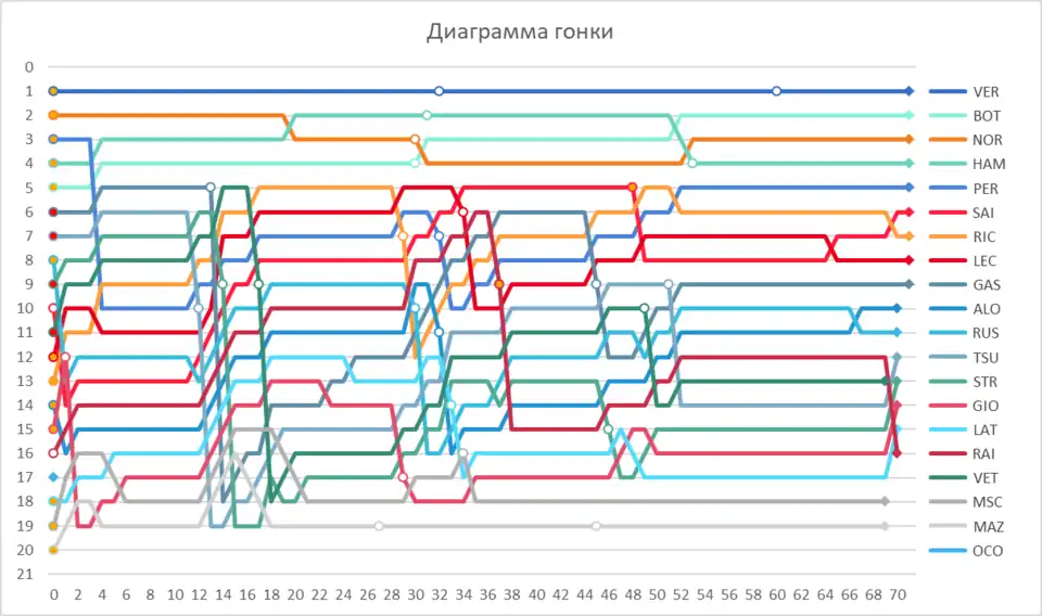 - ↑ Серхио Перес финишировал 5-м, но из-за 10-секундного штрафа, начисленного за вытеснение Шарля Леклера за пределы трассы, был классифицирован 6-м