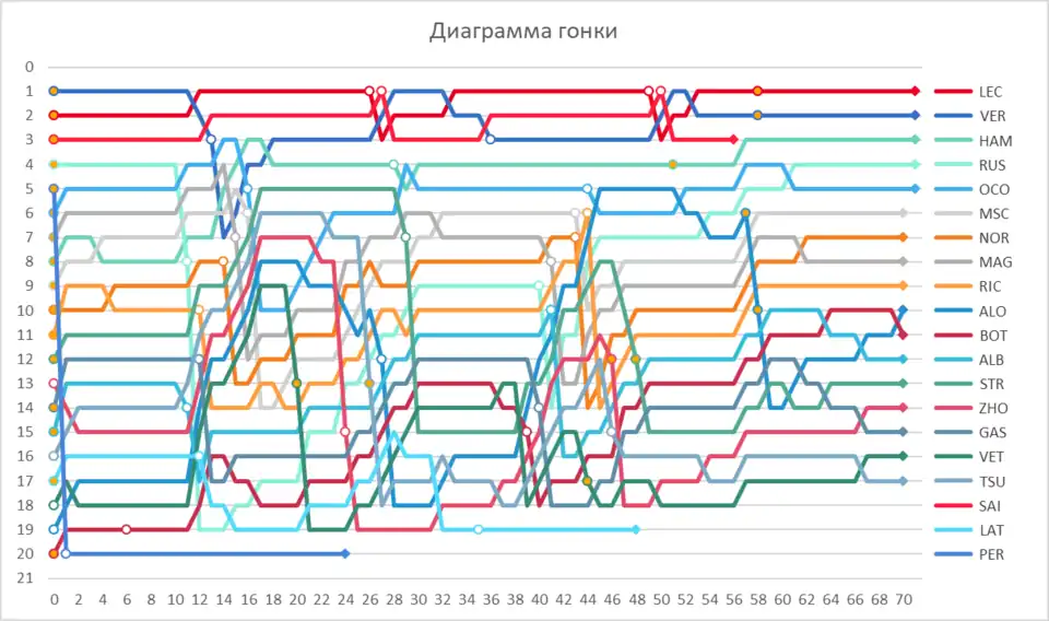 | 7 | 10 | ▲3 | 4 | McLaren-Mercedes | P | 70 | +1 круг | 214,426 | 2 | MHH | 6 | |