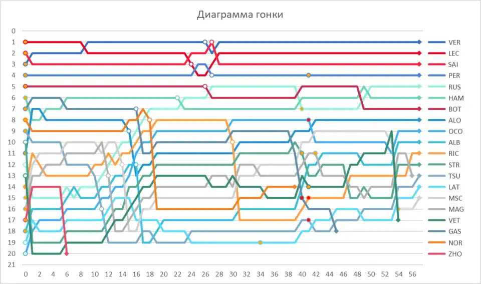 | Место | С | +/- | № | Гонщик | Конструктор | Ш | Круги | Время/причина схода | Скорость | Пит | Типы шин | О |