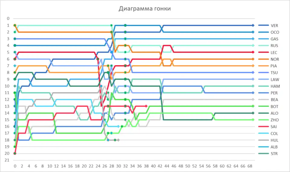 - ↑ Оскар Пиастри финишировал 7-м, но из-за 10-секундного штрафа, начисленного за столкновение с Лиамом Лоусоном, был классифицирован 8-м.
