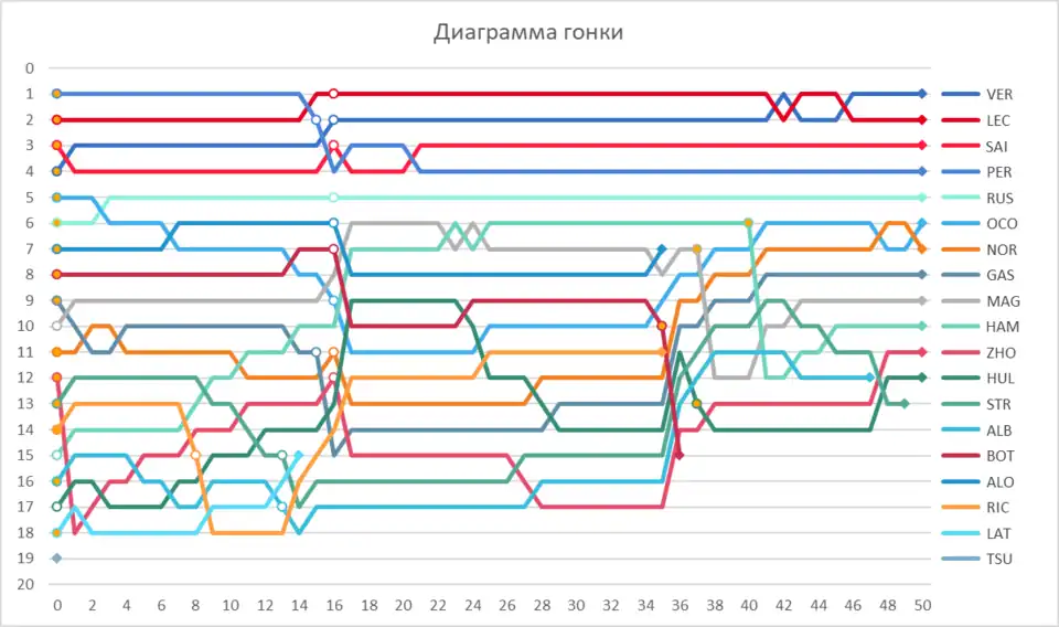 В лидирующей паре Ферстаппен пытался приблизиться к Леклеру, но тот всякий раз ускорялся и сохранял отрыв более одной секунды, необходимый для несрабатывания DRS. После 36 кругов сошли последовательно сначала Алонсо, потом Риккиардо и Боттас. Был объявлен режим виртуального пейс-кара, но воспользоваться этим до закрытия пит-лейна смогли только Хюлькенберг и Магнуссен, причем результат это принесло только последнему — он опередил Хэмилтона.