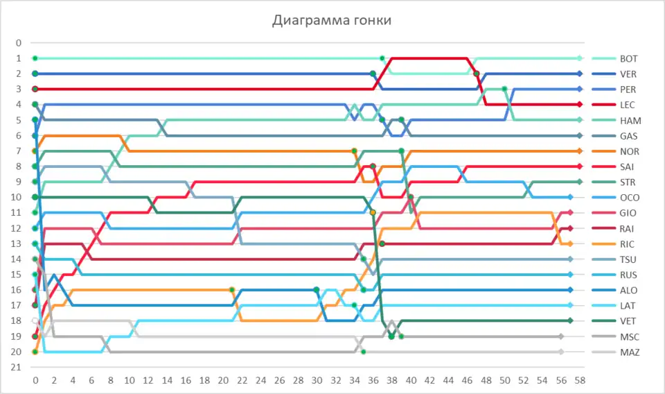 | Mercedes | 1 — 37, 47 — 58 | 49 | |