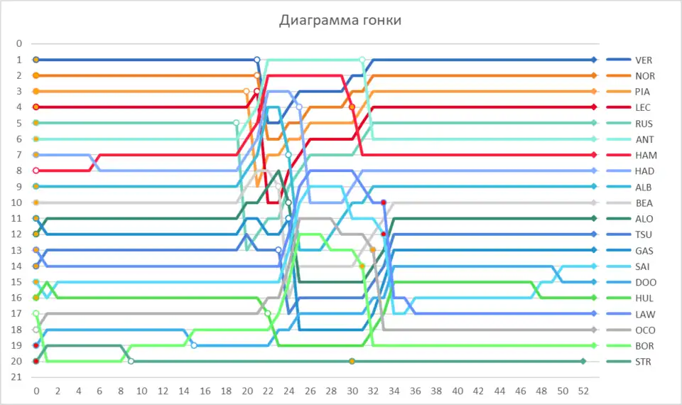 | 2 | 2 | ▬ | 4 | McLaren-Mercedes | P | 53 | +1,423 | 224,595 | 1 | MH | 18 | |