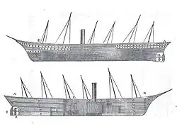 Внутреннее пространство было разделено на три палубы: две верхние для пассажиров и нижнюю для грузов. Две пассажирские палубы были разделены на носовой и кормовой отсеки, между которыми находились двигатели и котлы[36].