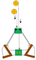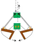 4. Зачерпывание груза и подъём грейфера: лебёдка работает на подъём; с помощью каната обойма сближается с головкой, челюсти поворачиваются, их кромки внедряются в груз и зачерпывают его; после закрытия грейфер вместе с грузом поднимается канатом[2].