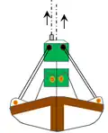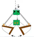 1. Подъём грейфера (на чертёже 3) с грузом: в момент окончания закрывания челюстей грейфера включается подъёмная лебёдка. Обе лебёдки работают на подъём, и усилия в подъёмном и замыкающем канатах выравниваются[2].