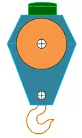 Они состоят из двух щёк — литых или из листового металла, между которыми на осях вращаются канатные блоки. В нижней части щёк траверсой закреплён грузовой крюк[3].