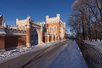 Комплекс имеет в плане форму трапеции. Внешне он имитирует английский готического замок с элементами стиля Тюдоров[4]. По углам расположены 9 массивных башен (в их верхних этажах были помещения для царского конвоя). Огромный манеж в центральной части комплекса имел систему открытых деревянных стропил. В манеже была предусмотрена особая императорская ложа[2].